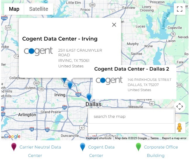 Cogent has many other On-Net buildings in the greater Dallas area. We also have On-Net buildings in Fort Worth, Austin, Houston, El Paso, McAllen, San Antonio, and Amarillo. This includes office buildings and other data centers.
